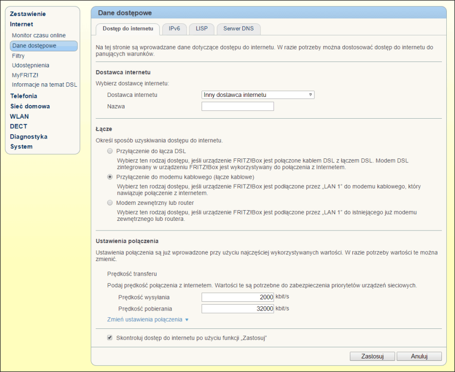 Aby podłączyć router FRITZ!Box do zewnętrznego routera lub modemu należy w menu "Internet/Dane dostępowe" zaznaczyć opcję "Modem zewnętrzny lub router"