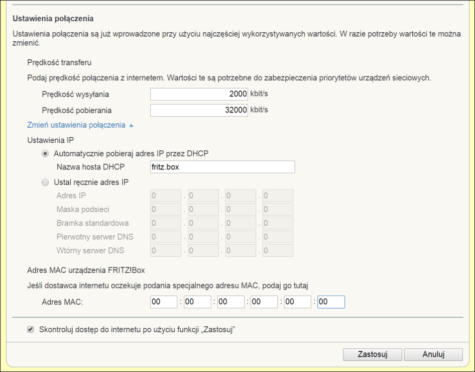 UWAGA!Routery FRITZ!Box nie pozwalają na występowanie w sieci urządzeń z takimi samymi adresami MAC. Jeśli przypisany adres MAC już występuje, nie będzie możliwe nawiązanie połączenia z siecią.W menu "Internet, Dane dostępowe" należy zaznaczyć opcje: