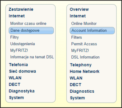 - W menu routera http://fritz.box należy przejść do "Internet/Dane dostępowe" ("Internet/Account information" w angielskiej wersji)