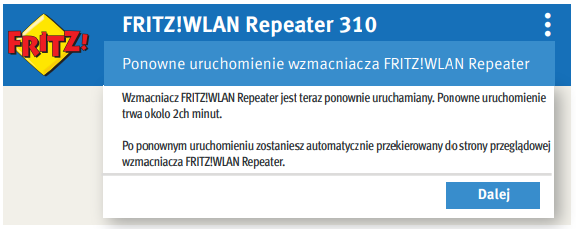 Nastąpi ponowne uruchomienie urządzenia FRITZ!Repeater. Cała procedura może potrwać do 2 minut.
