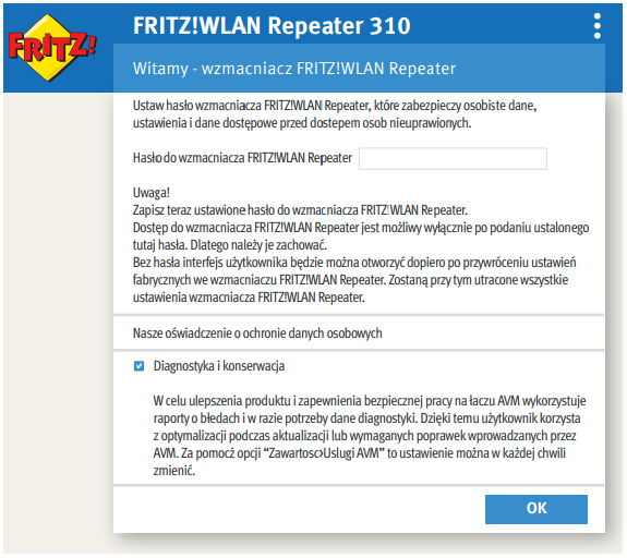 W kolejnym oknie użytkownik jest proszony o zdefiniowanie hasła administratora urządzenia FRITZ!Repeater. Jest to hasło używane wyłącznie do zarządzania urządzeniem i powinno różnić się od hasła dostępowego do sieci oraz hasła do routera.