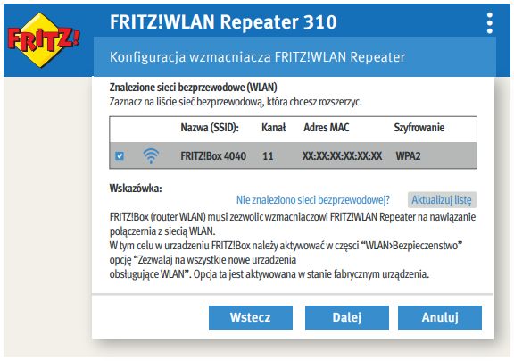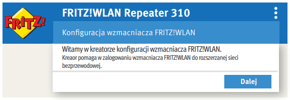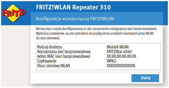 Ważne! Po skonfigurowaniu, sieć "FRITZ!Repeater" nie będzie już dostępna. Wzmacniacz przejmuje nazwę sieci i hasło z routera. Jeśli hasło do sieci Wi-Fi było błędnie wprowadzone - wzmacniacz nie nawiąże połączenia z routerem. W takiej sytuacji należy przywrócić wzmacniacz FRITZ!Repeater do ustawień fabrycznych (nacisnąć i przytrzymać przycisk WPS/Connect na 15 sek i odczekać ok 1 min) i powtórzyć konfigurację od początku.