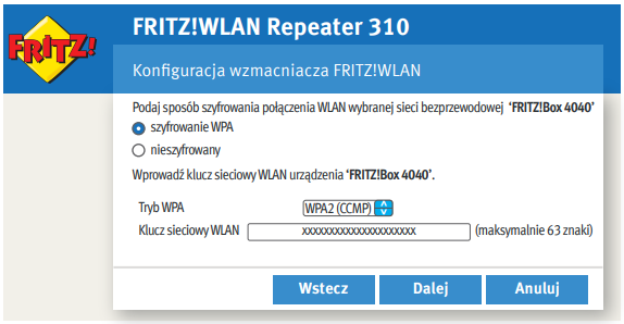 W kolejnym kroku użytkownik proszony jest o podanie rodzaju szyfrowania i klucza do sieci, której zasięg zamierza zwiększyć. Po podaniu tych informacji można przejść do kolejnego kroku klikając "Dalej".