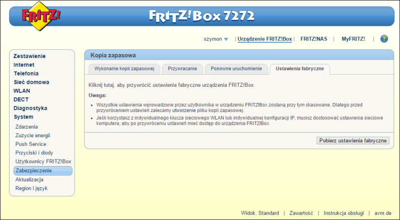 Przywracanie FRITZ!Box do ustawień fabrycznych
